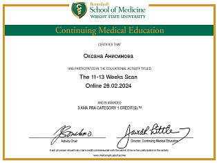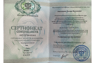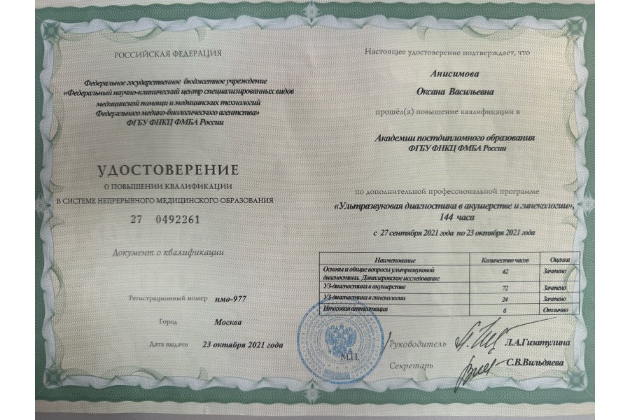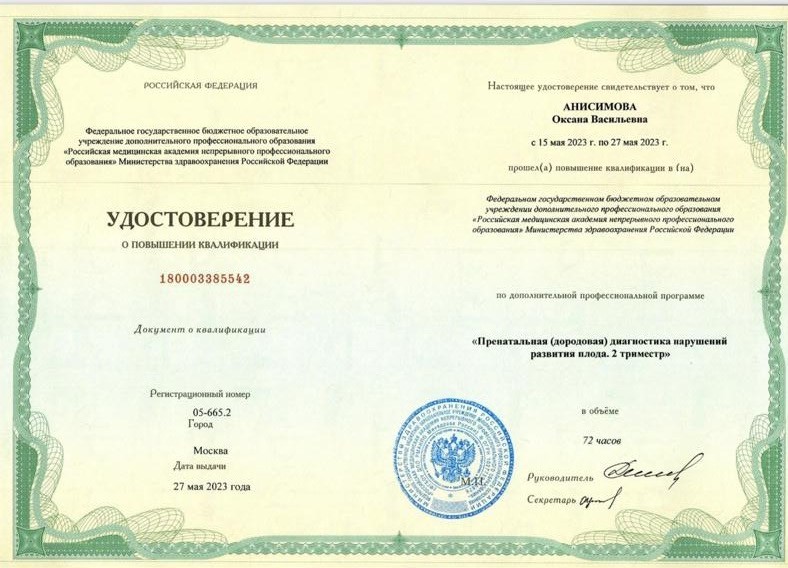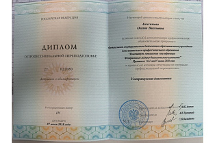 - Профессиональная переподготовка по специальности «Ультразвуковая диагностика», 2018 г.