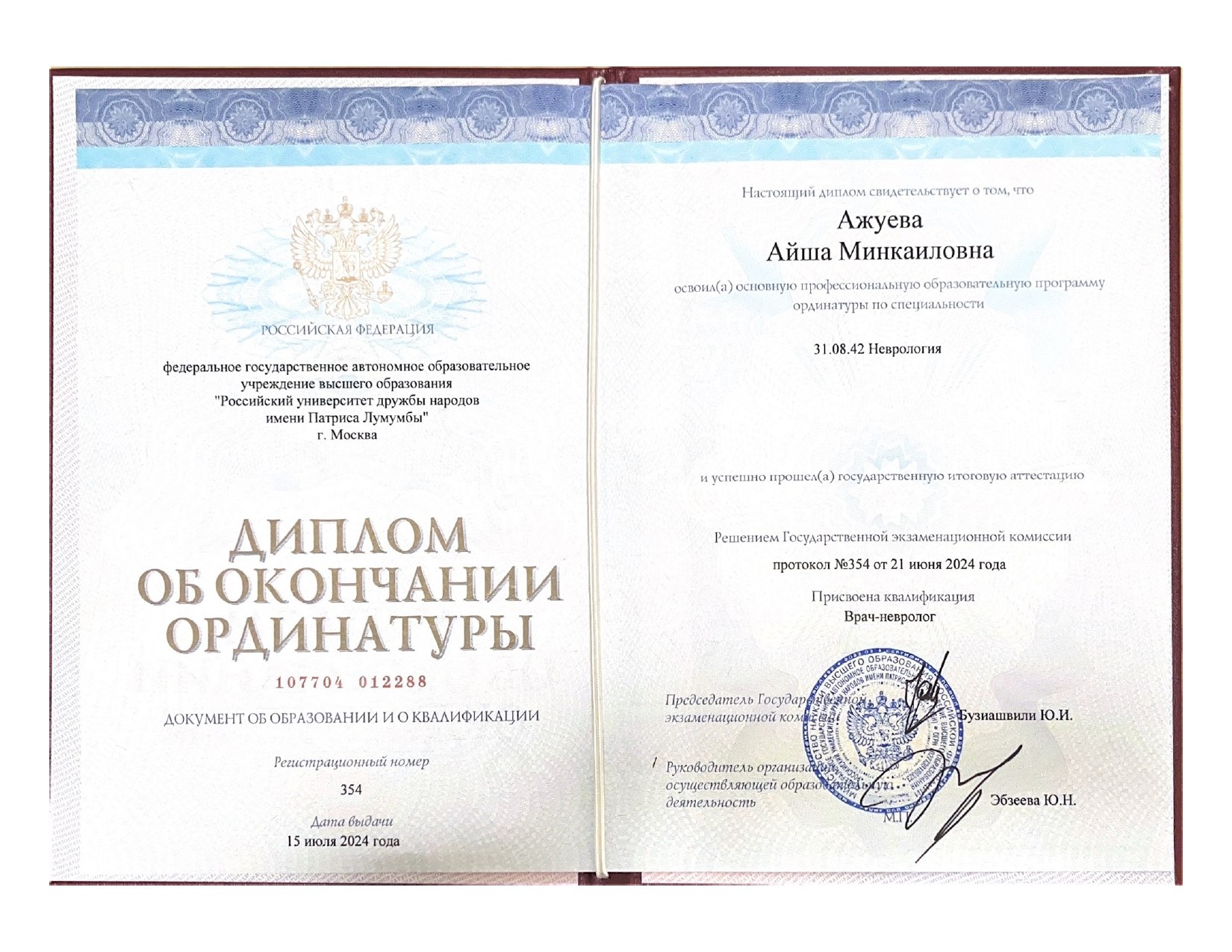 • 2024 г. - РУДН, кафедра неврологии и нейрохирургии