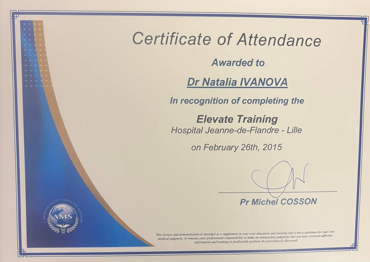 • 2015 - Франция, Лиль, стажировка по лечение опущения половых органов с использованием сетчатых имплантов (элевейт)