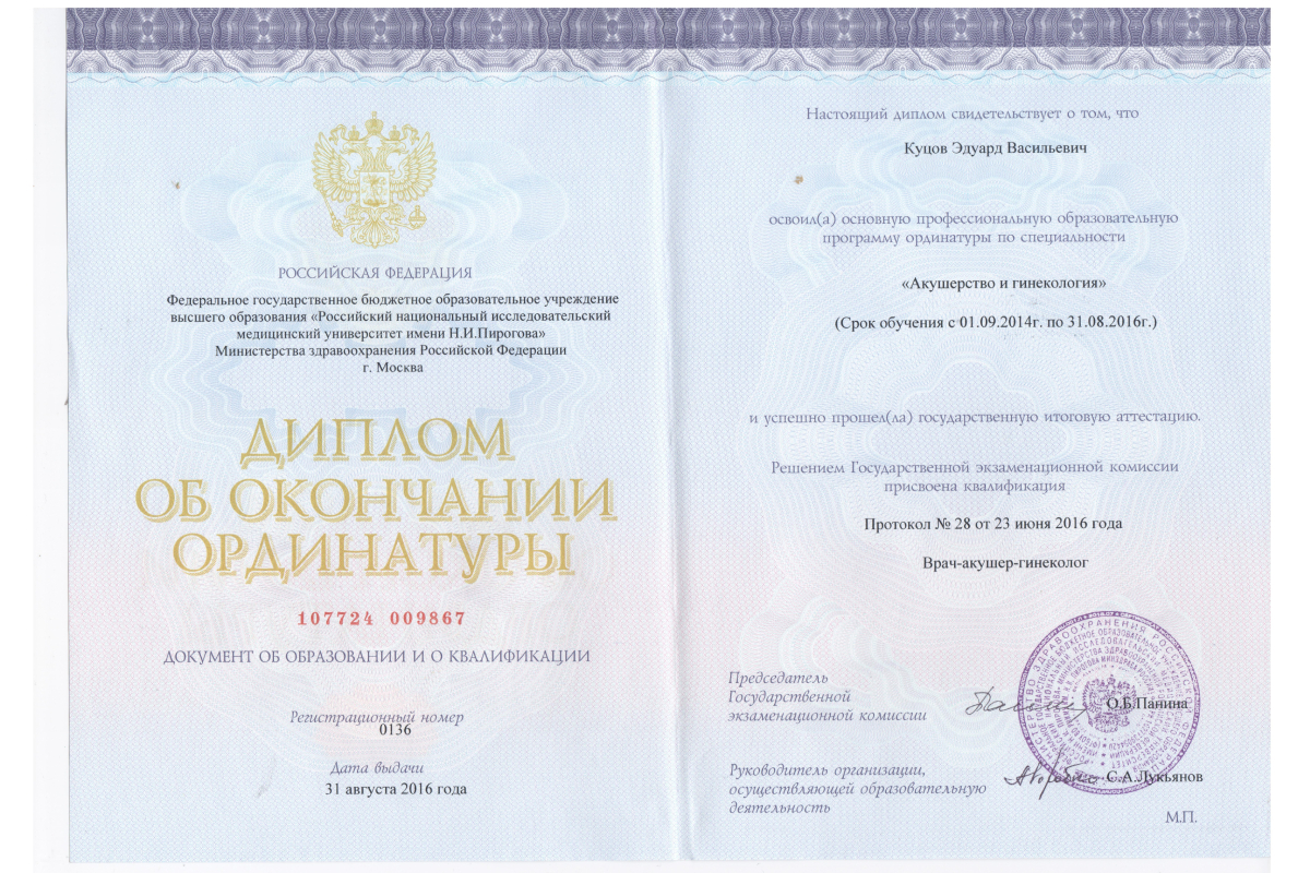 • 2016 г. - ГОУ ВПО РНИМУ им. Н.И. Пирогова, клиническая ординатура по специальности «акушерство и гинекология»