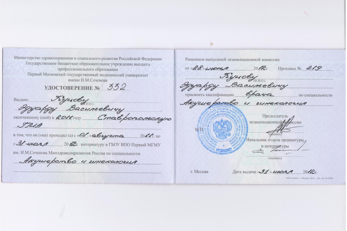 • 2012 г. - ГОУ ВПО ПМГМУ им. И.М. Сеченова, клиническая интернатура по специцальности «акушерство и гинекология».