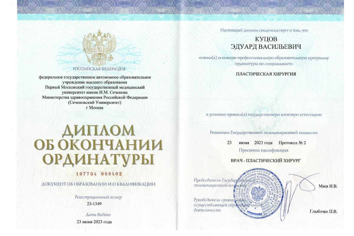 • 2023 г. - ГОУ ВПО ПМГМУ им. И.М. Сеченова, клиническая ординатура по специальности «пластическая хирургия»