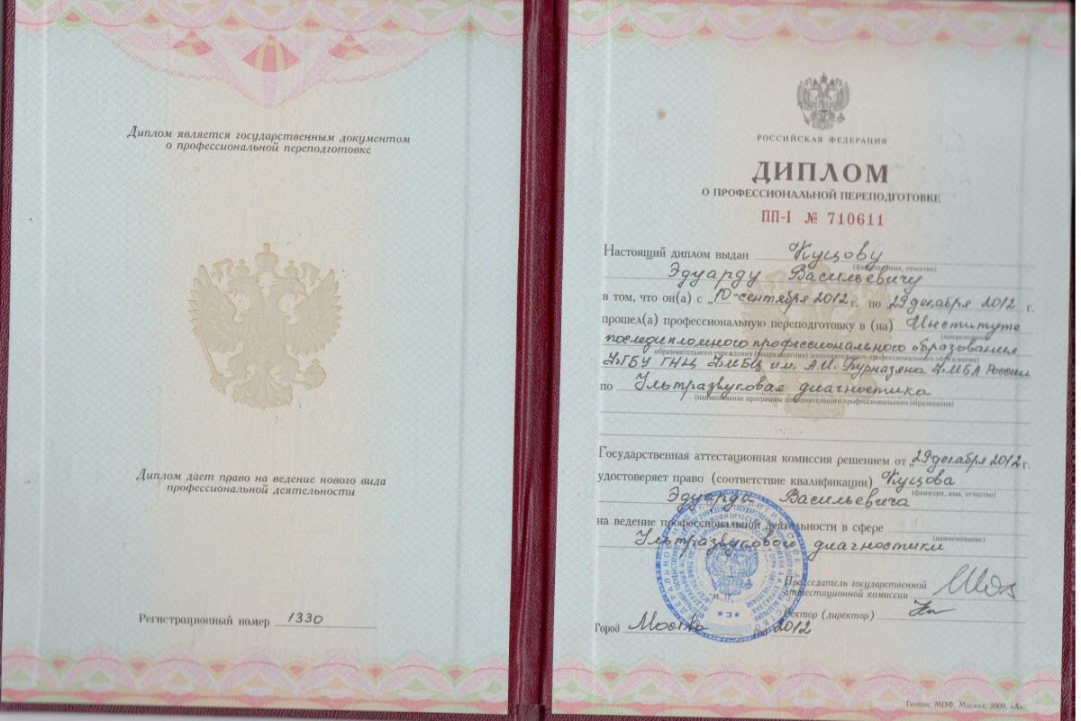 • 2012 г. - ФГБУ ГНЦ ФМБЦ им. А.И. Бурназяна ФМБА, профессиональная переподготовка по специальности «ультразвуковая диагностика».