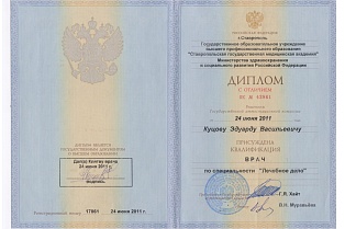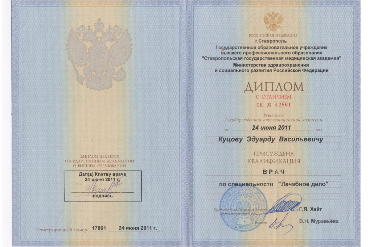• 2011 г. - ГОУ ВПО Ставропольская государственная медицинская академия МЗ РФ, специальность - лечебное дело.