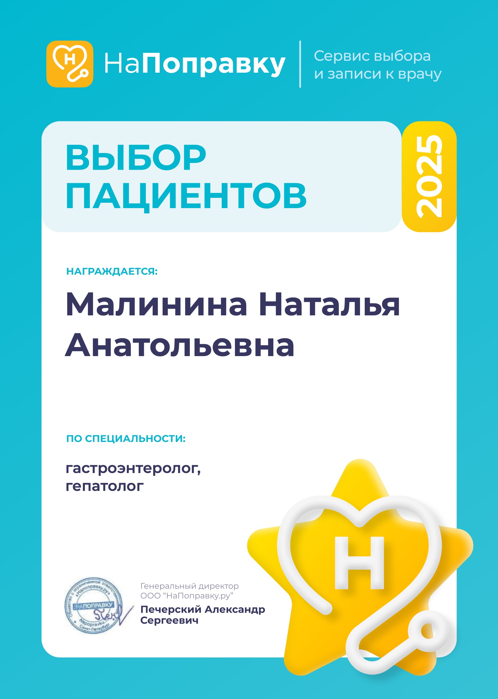 • 2010 г. – Саратовский государственный медицинский университет им. В. И. Разумовского, профессиональная переподготовка по специальности «гастроэнтерология»
