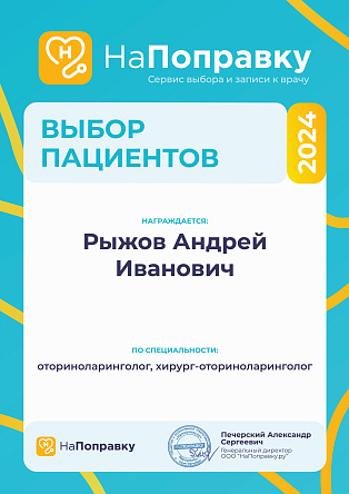 Хочу выразить огромную благодарность Рыжову Андрею Ивановичу. Оперировал ребенка 5 лет (Гипертрофия аденоидов 3 степени). Сын мучился с насморком и отитами 4 месяца, были во многих клиниках, проходили разные лечения, диагнозы были разнообразными, но улучшений не было! Я уже не знала, что делать. Очень долго искали врача, чтобы поставили верный диагноз. По счастливой случайности нам удалось найти высоквалифицированного, внимательного ЛОР-врача. На приеме Андрей Иванович сразу «расположил» к себе ребенка, осмотрел сына, поставил верный диагноз. Все объяснил, рассказал. Было принято решение оперировать. Операция прошла быстро, ребенок даже не понял, что произошло) В обед уже были дома После операции прошло 2 месяца, со дня операции сын чувствует себя замечательно, осложнений не было Андрей Иванович, спасибо Вам огромное!