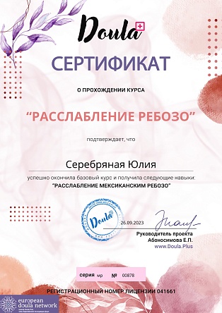- 2023 г. – Курс «Взаимодействие с пациентом в ситуации перинатальной потери», Благотворительный фонд «Свет в руках», г. Москва