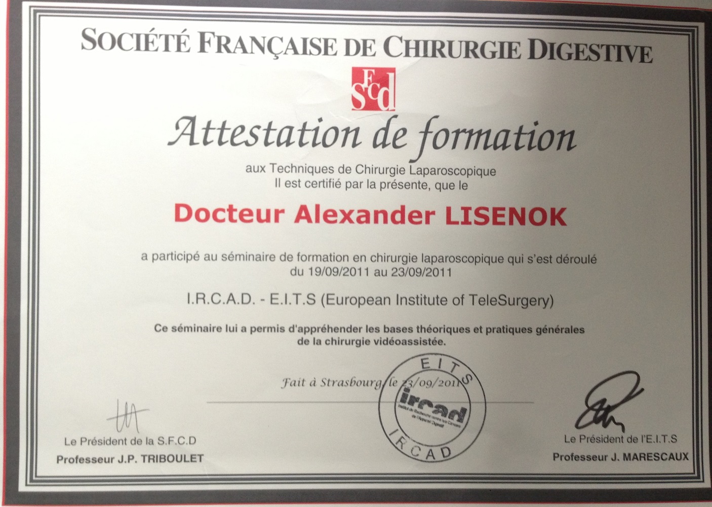 - Клиника Севиль (Иркад), стажировка по «Общей хирургии и лапароскопии», Страсбург, Франция.
