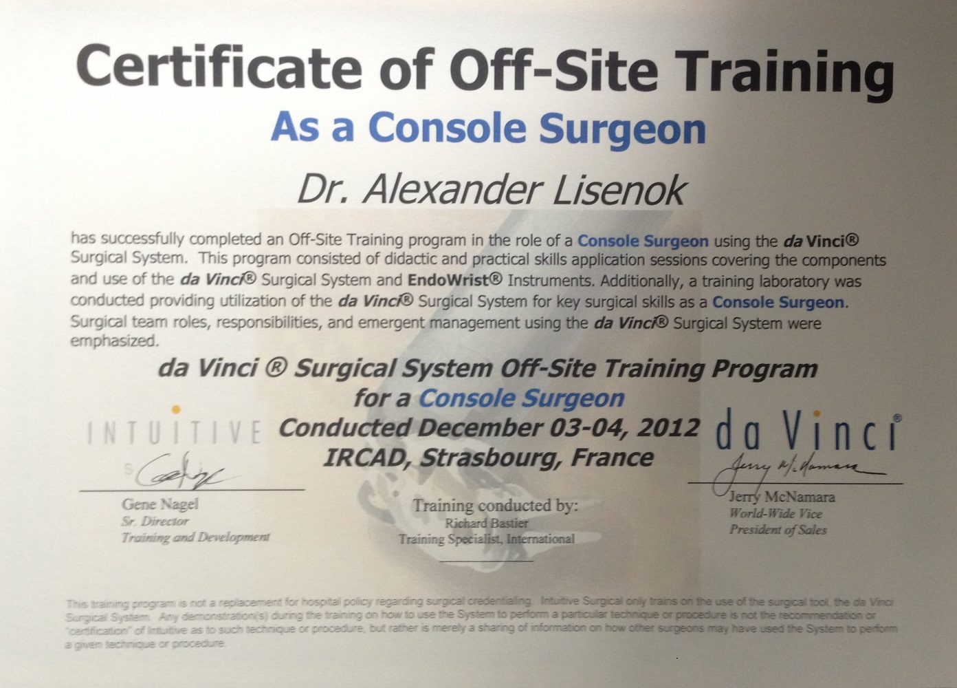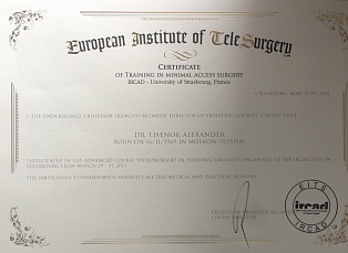 - Клиника Севиль (Иркад), индивидуальная стажировка по «Роботическим операциям и мини-лапароскопии», Страсбург, Франция.