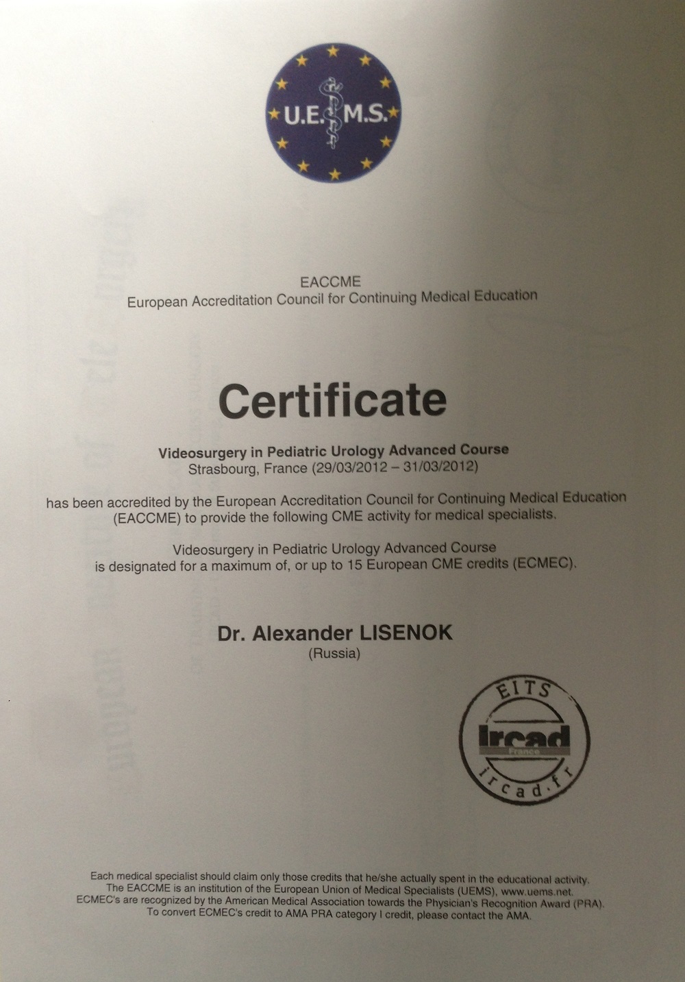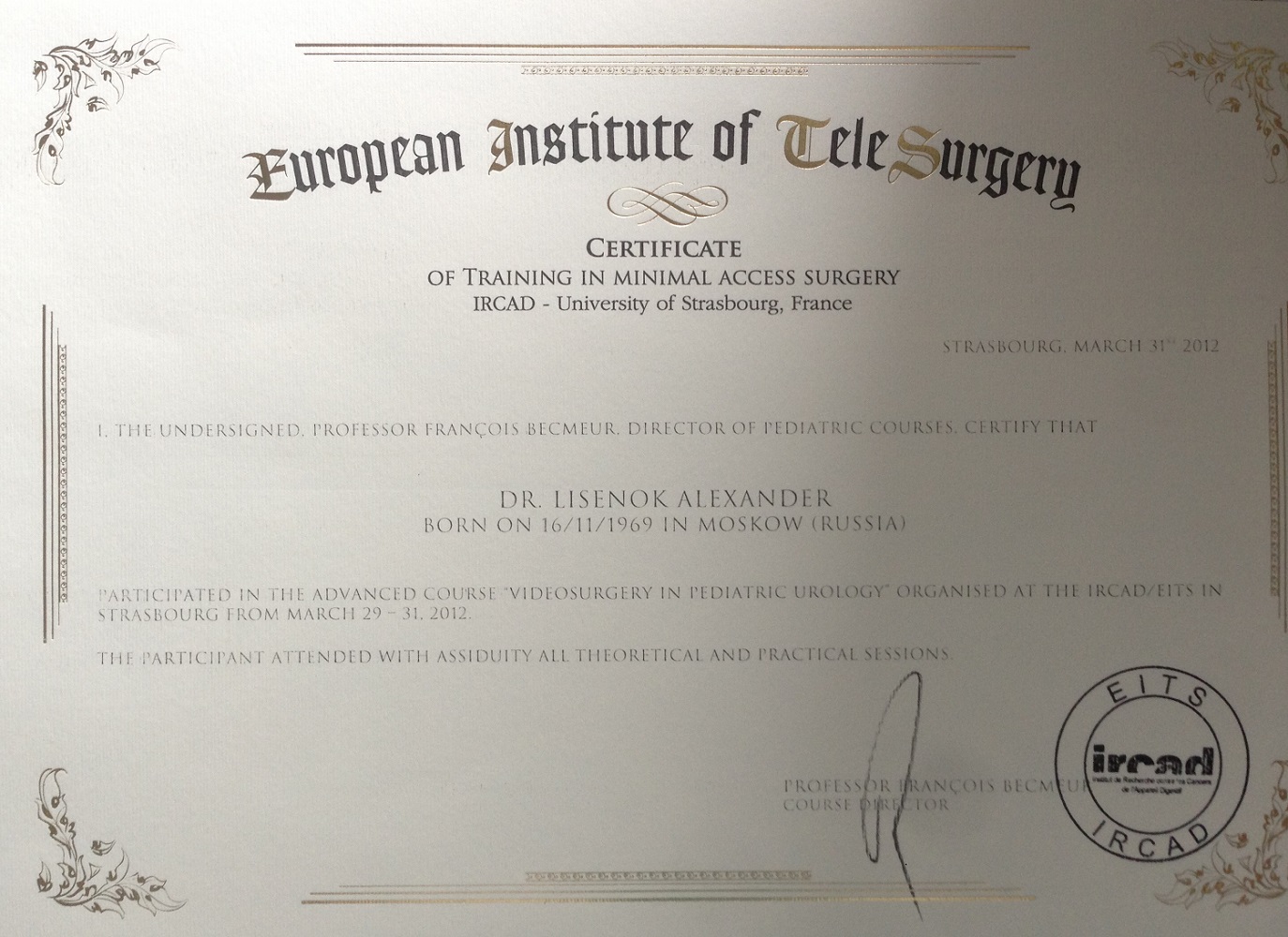 - Клиника Севиль (Иркад), стажировка по «Детской хирургии и урологии с курсом лапароскопии», Страсбург, Франция.